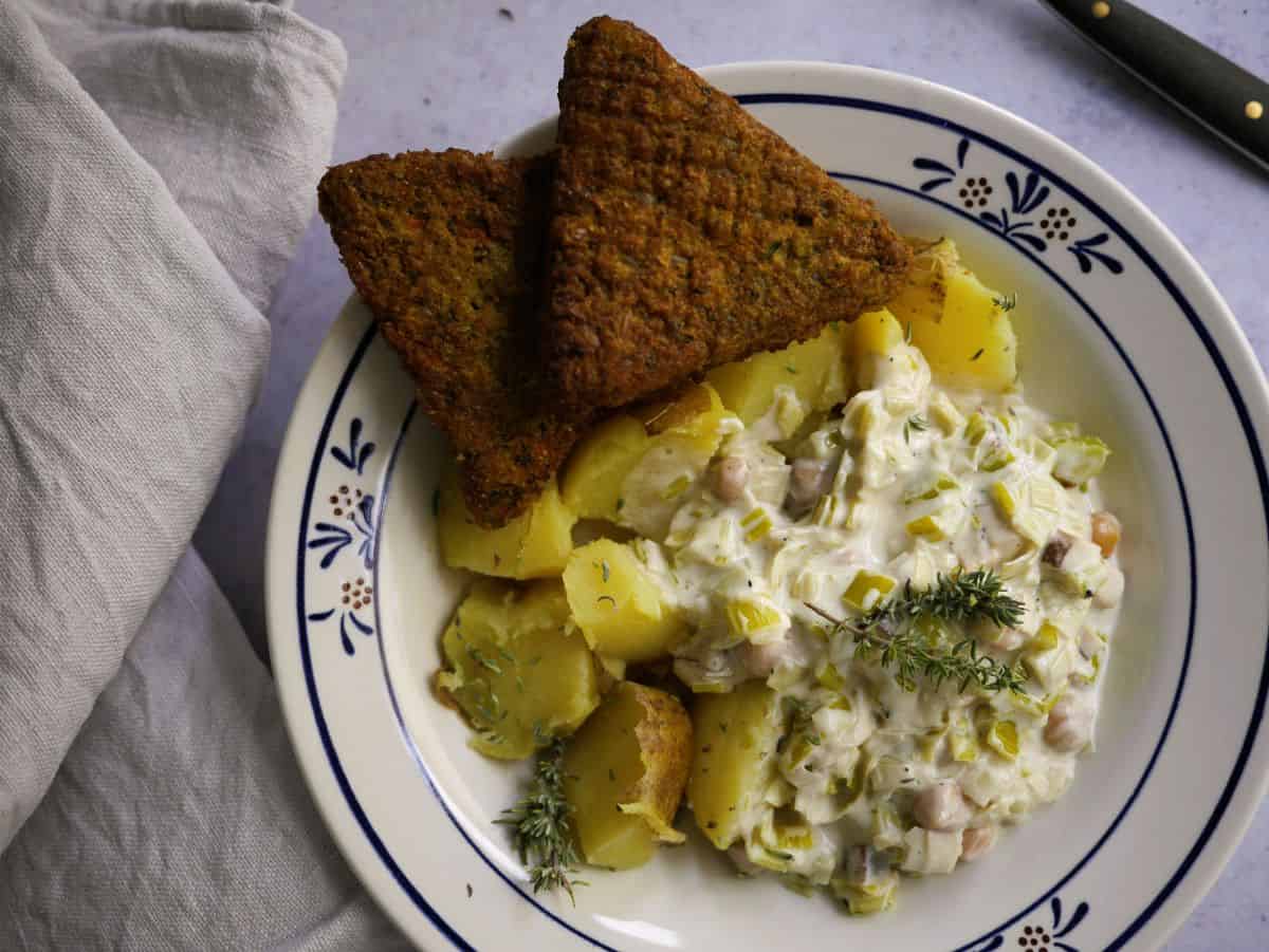 The only true musts are: the leeks (naturally), neutral oil, vegan cooking cream, and your seasonings (nutmeg, salt, and pepper). That's your base. Now you choose your favorite carb. Potatoes if you want to have the full-blown German leeks in white sauce experience. Or a slice of soft bread for mopping out the sauce. Millet is a solid choice as well.