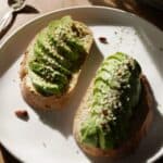 Arrange one avocado half on each slice of bread.Tip: If you're in a hurry, you can also scoop the avocado directly onto the bread and mash it roughly with a fork.